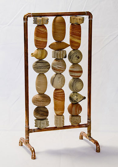 Cluster sind Ballungen von ähnlichen Elementen (z.B. Klangballungen in der Musik ). Meinen Clustern ist die Idee gemeinsam, in einen starren Rahmen (Metall) bewegliche Objekte (Keramik) einzubinden, die den Betrachter zum Spielen anregen sollen. Dabei kann er - sofern er sich darauf einlässt - durch das (Ver-)Drehen und (Ver-) Schieben der einzelnen Teile das Erscheinungsbild des Objektes innerhalb eines vorgegebenen Spielraums verändern.